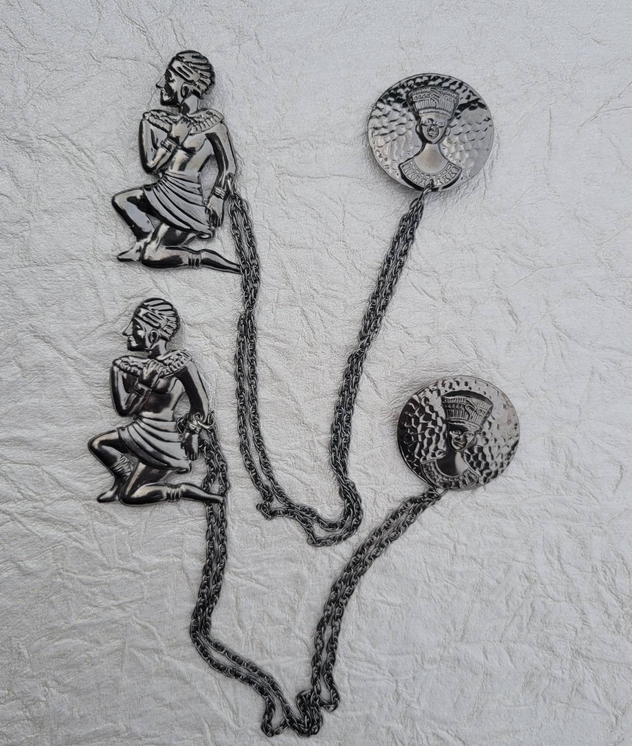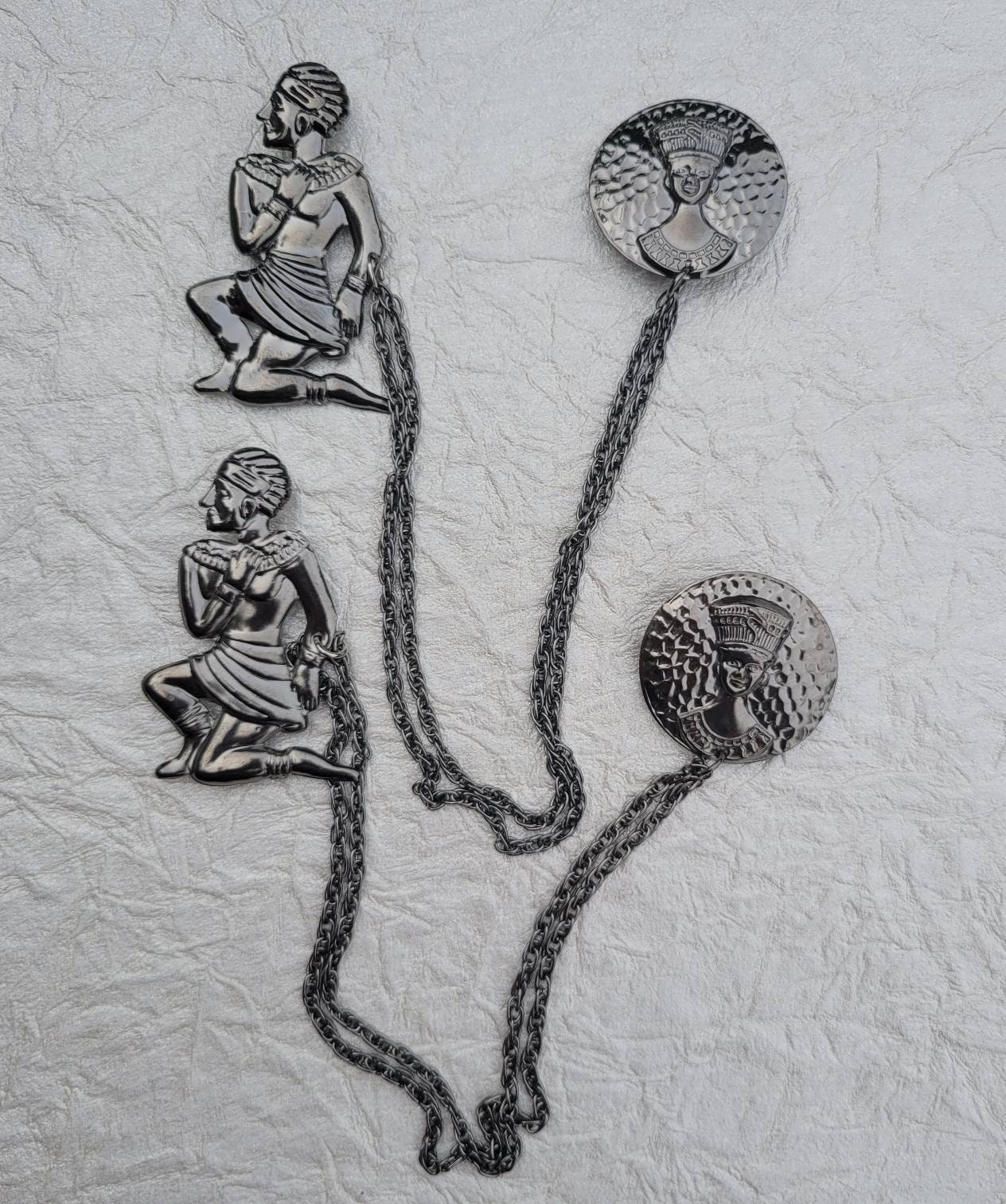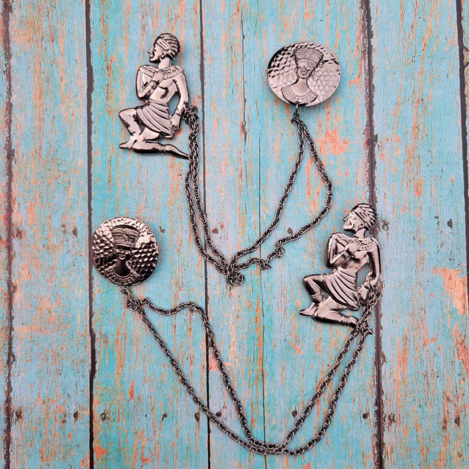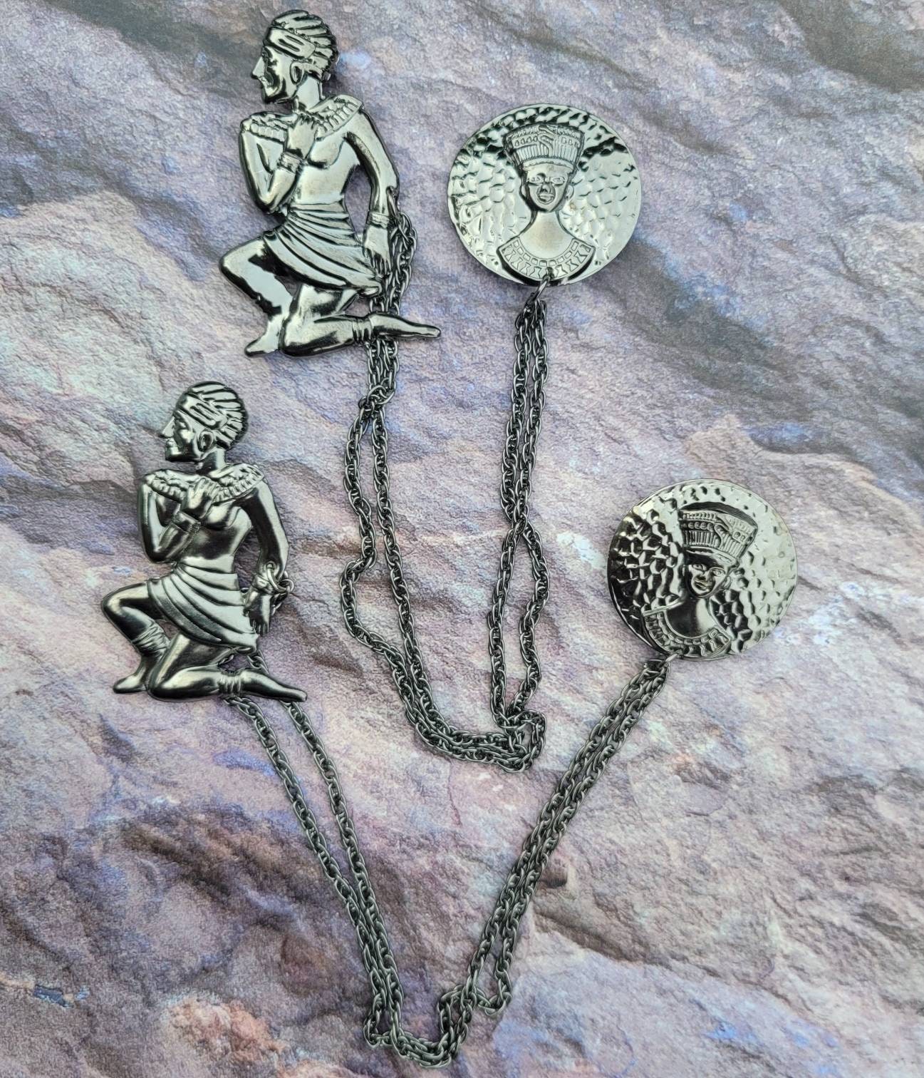 These pins are very cool! Two lightweight Egyptian pins with two matching gunmetal silver tone chains that bind the two pins together.